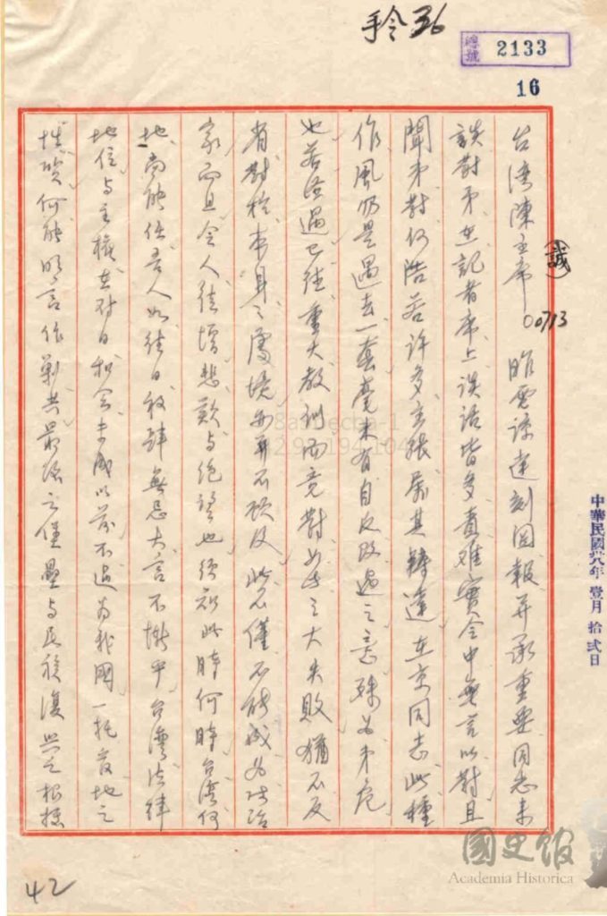 Chiang Kai-shek’s letter to Chen Cheng, noting “Taiwan is only a trusteeship territory” .